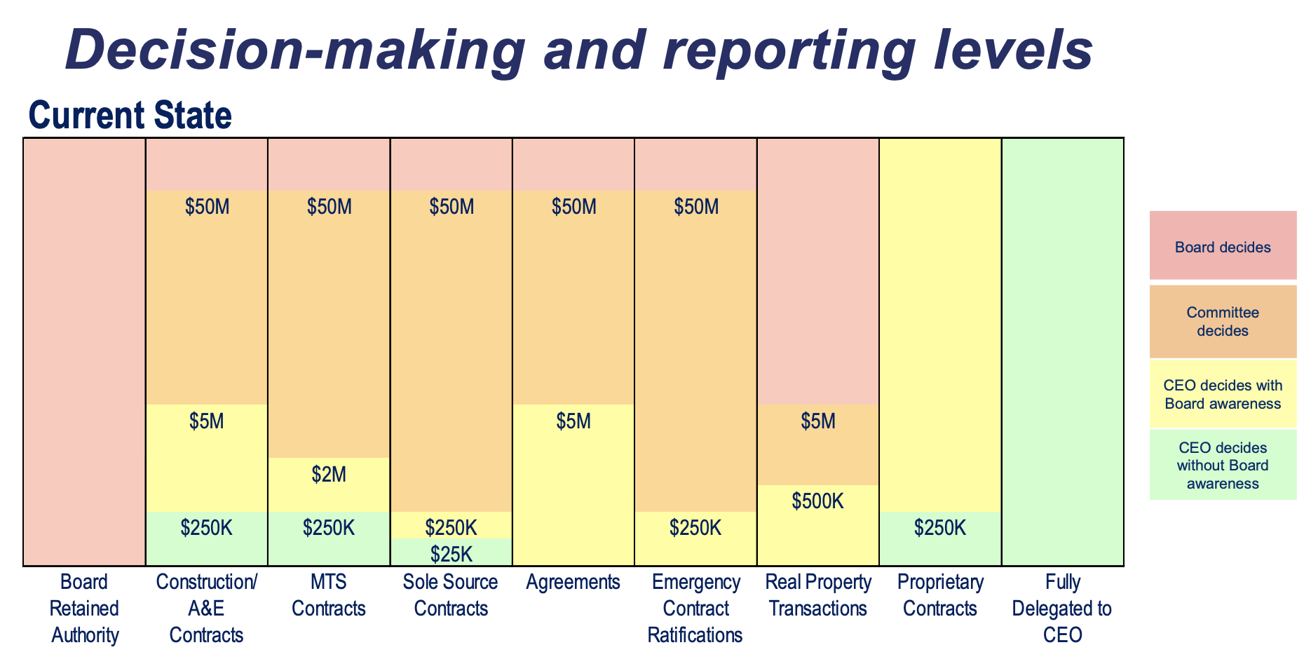 Boardmembers will have to settle on expenditure amounts and circumstances that they are comfortable with the CEO making sole decisions on, but the option seeming to have the backing of committees is expected to reduce approvals by 9% in the System Expansion Committee and 35% in the Rider Experience and Operations, which translates to about 17 actions per year.