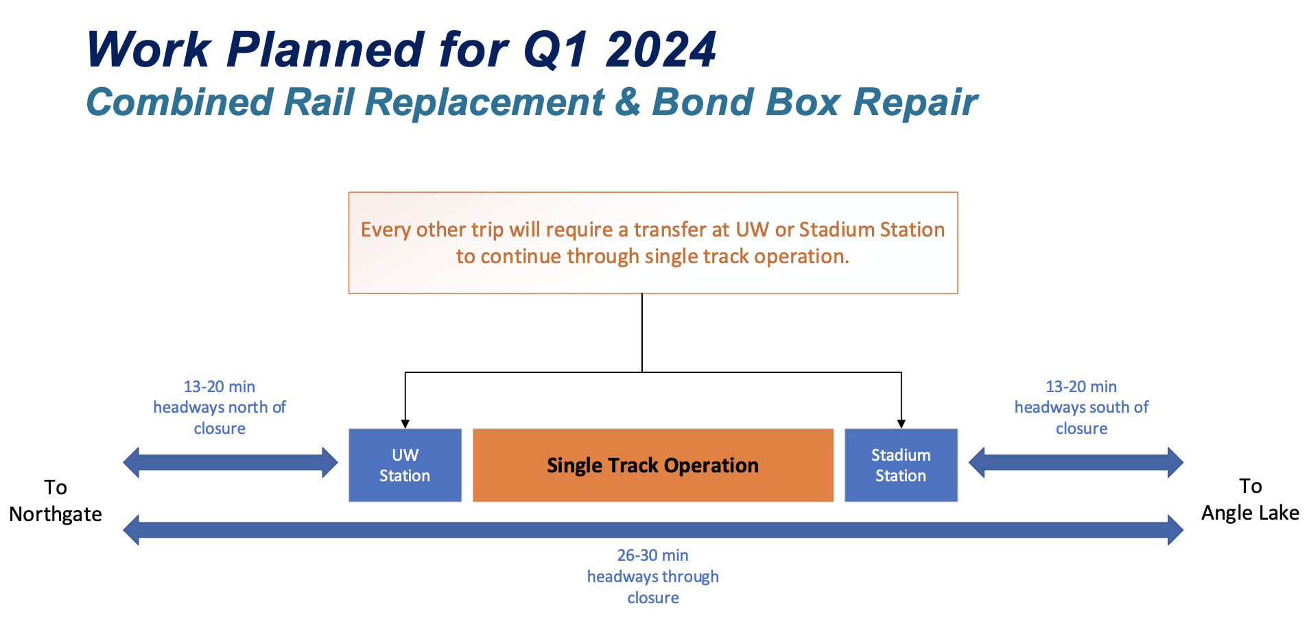 A graphic reads "Combined rail replacement and bond box repair work planned in Q1 2024" and 13-20 minutes north of the closure and 26-30 minute headways through the closure from UW Station to Stadium Station. 13-20 minutes headways south of the closure. A note states every other trip will require a transfer to continue through single track operation in the closure section.