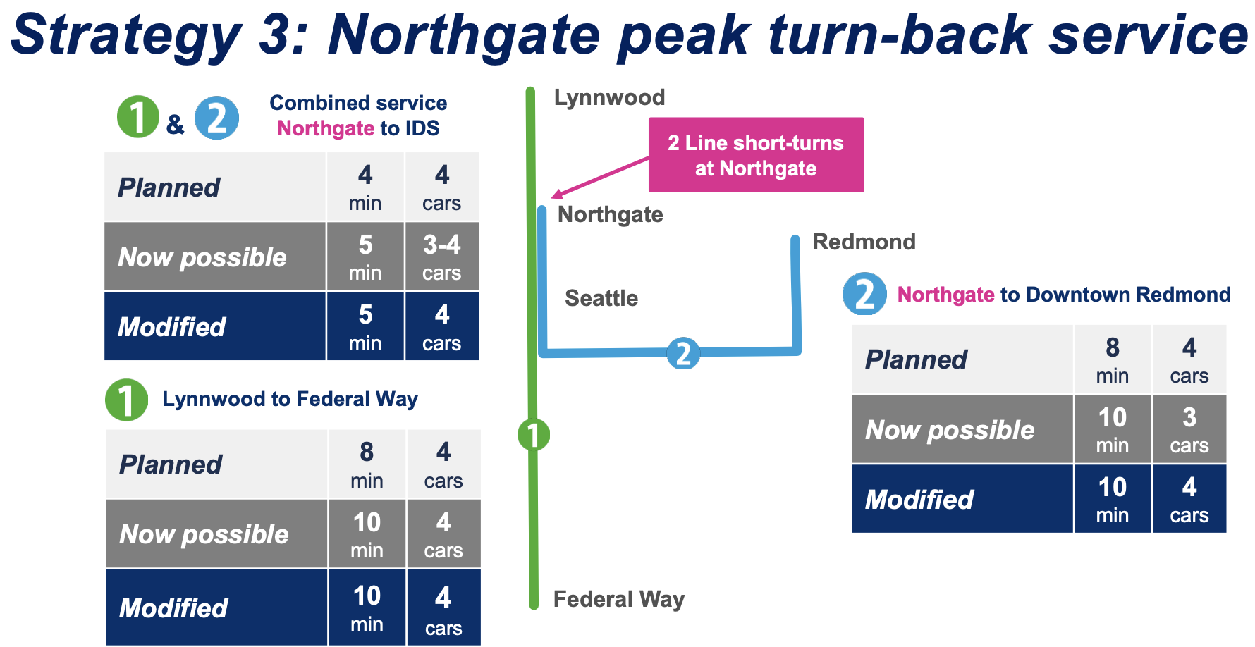 A new third strategy formally entering the fray is turning back some trips at Northgate — though the agency had hinted at this earlier this year. This would involve shortening 2 Line service once East Link is able to cross I-90. 2 Line trains would terminate eight miles sooner at Northgate instead of Lynnwood. That would cover the most crowded segment of the system and ensure that all trips, whether on the 1 Line or 2 Line, would have four-car trains — increasing capacity by 14% in the segment.