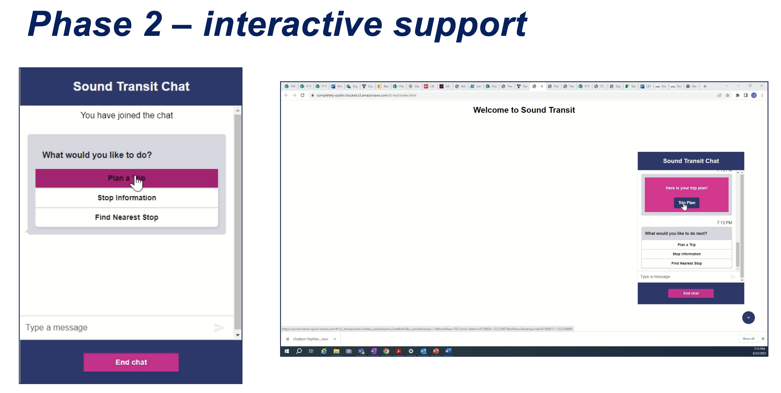 “The chatbot has three primary components: the trip planning and information component that are fed from the open trip planner, frequently asked questions and a knowledge base, which includes answers to questions about lost and found, service animals, and ORCA, and then an interactive support so you can live chat with passenger care staff,” Olson said. Those features are expected to roll out in the spring.