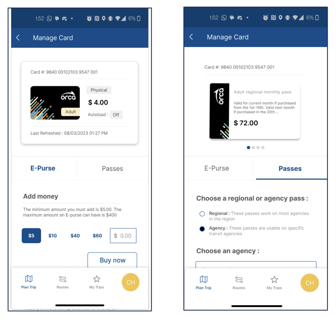“This summer’s user experience intern conducted extensive user experience research on fare payment integration,” Olson said. “We surveyed and interviewed passengers on design screens for what the integration could look like.” A mockup shared with the committee showed digital e-purse and e-passes that users could purchase for journeys. Adding money to the e-purse or purchasing regional or agency e-passes to a digital ORCA card could be as easy as a few taps using the apps.