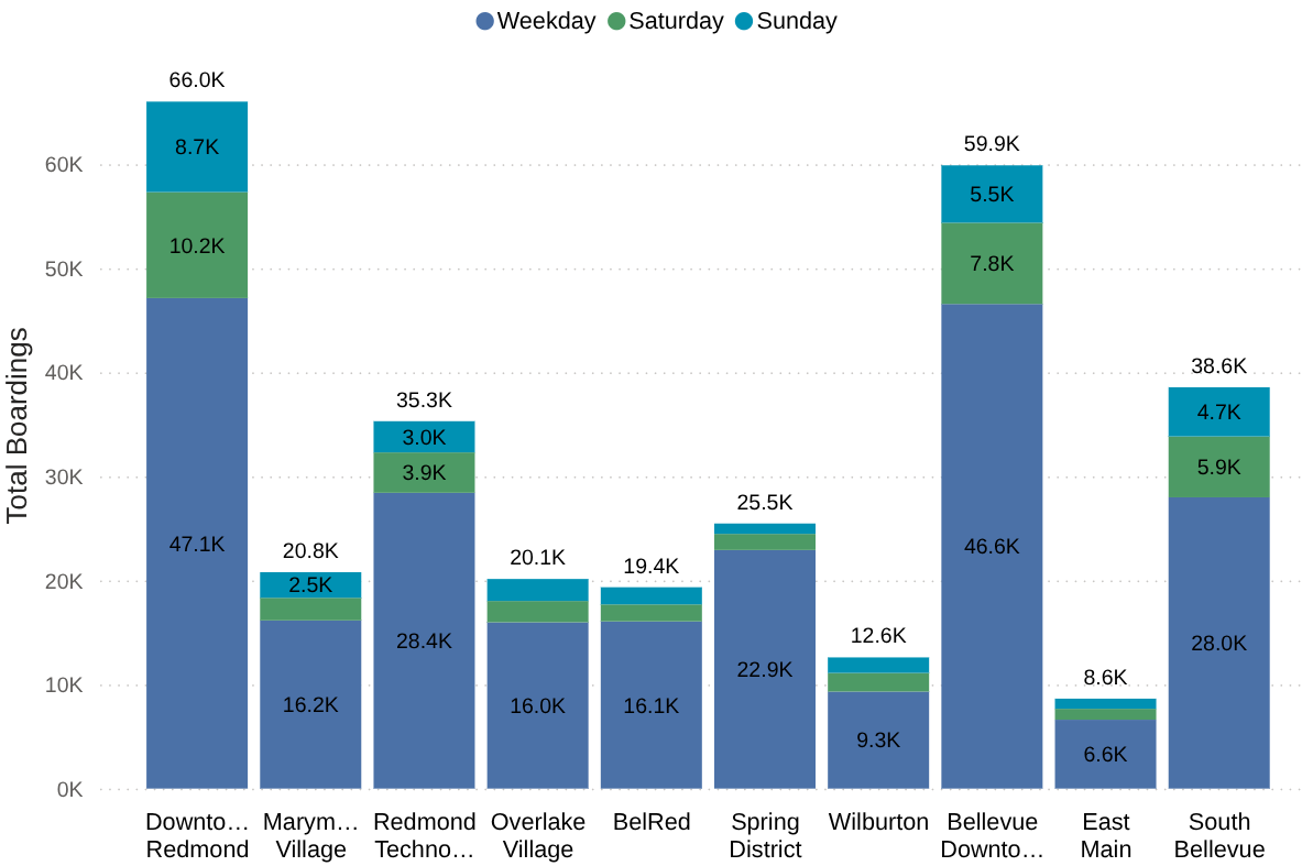Downtown Redmond remains the most popular station, with Downtown Bellevue close on its heels. South Bellevue and Redmond Technology Stations were a distant third and fourth. Wilburton and East Main, which have lagged behind other stations in Bellevue when it comes to nearby land use changes and development, have the lowest ridership. Bellevue has an impressive vision for Wilburton in particular, though those plans will likely take decades to come to fruition.