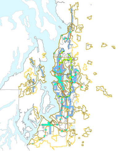 Stripping out non-BRT grade bus service and reducing walkshed radii to a quarter-mile greatly scaled back the scope of the bill, as shown in the maps below which updated after that amendment entered the legislation. Halving the radius results in the area of the walkshed being cut by 75% due to power of squares in math. State lawmakers seem intent on defining King County’s Metro’s RapidRide lines and Community Transit’s Swift service as BRT. Little else qualifies, which is an indictment of how little our state invests in bus service.