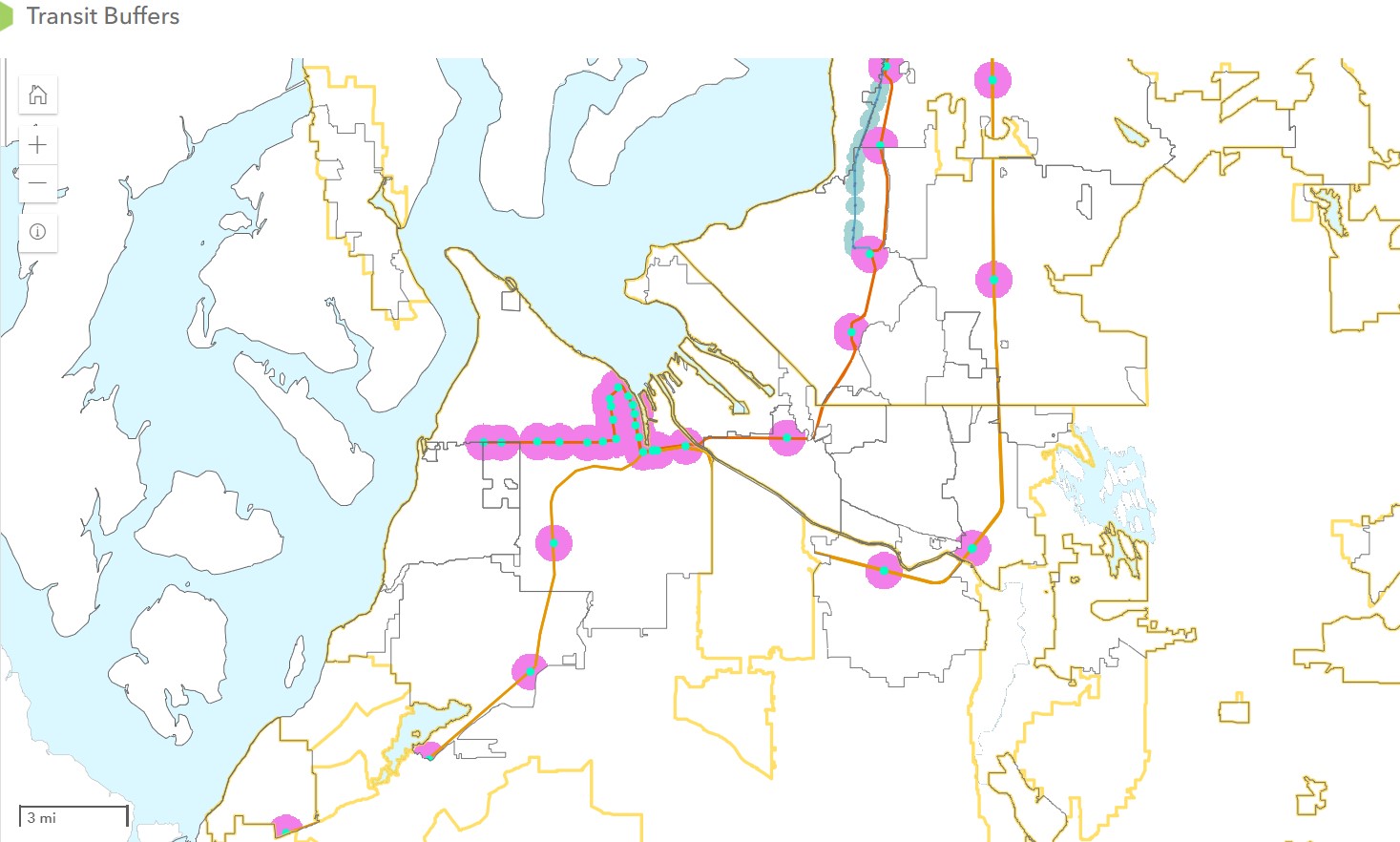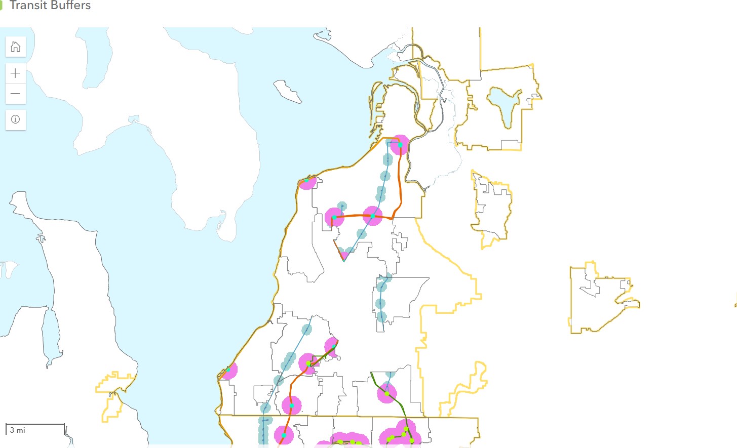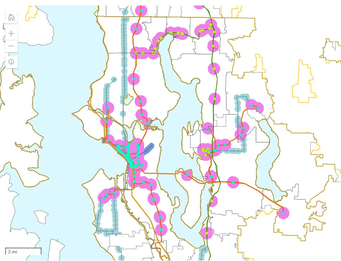 Stripping out non-BRT grade bus service and reducing walkshed radii to a quarter-mile greatly scaled back the scope of the bill, as shown in the maps below which updated after that amendment entered the legislation. Halving the radius results in the area of the walkshed being cut by 75% due to power of squares in math. State lawmakers seem intent on defining King County’s Metro’s RapidRide lines and Community Transit’s Swift service as BRT. Little else qualifies, which is an indictment of how little our state invests in bus service.