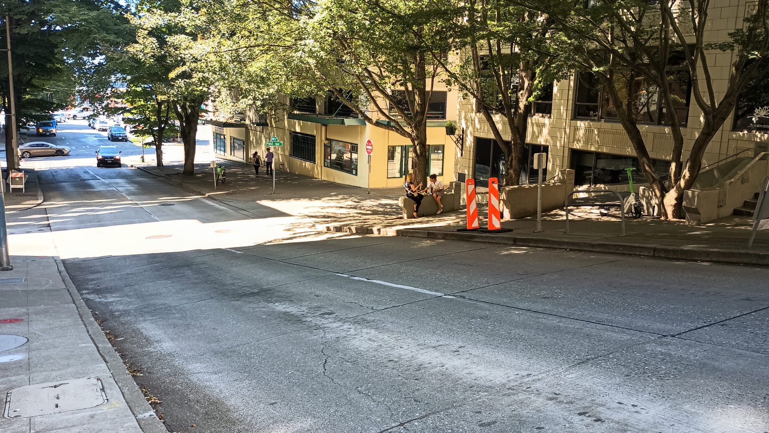 But the brand new bike lane is less than 200 feet long, with street markings at Western Avenue sending eastbound bike riders across a diagonal at a four-way stop onto the other side of the street to head up the hill, and if they continue another three blocks they’ll need to cross back again to get into another two-way bike lane at Occidental Avenue S.