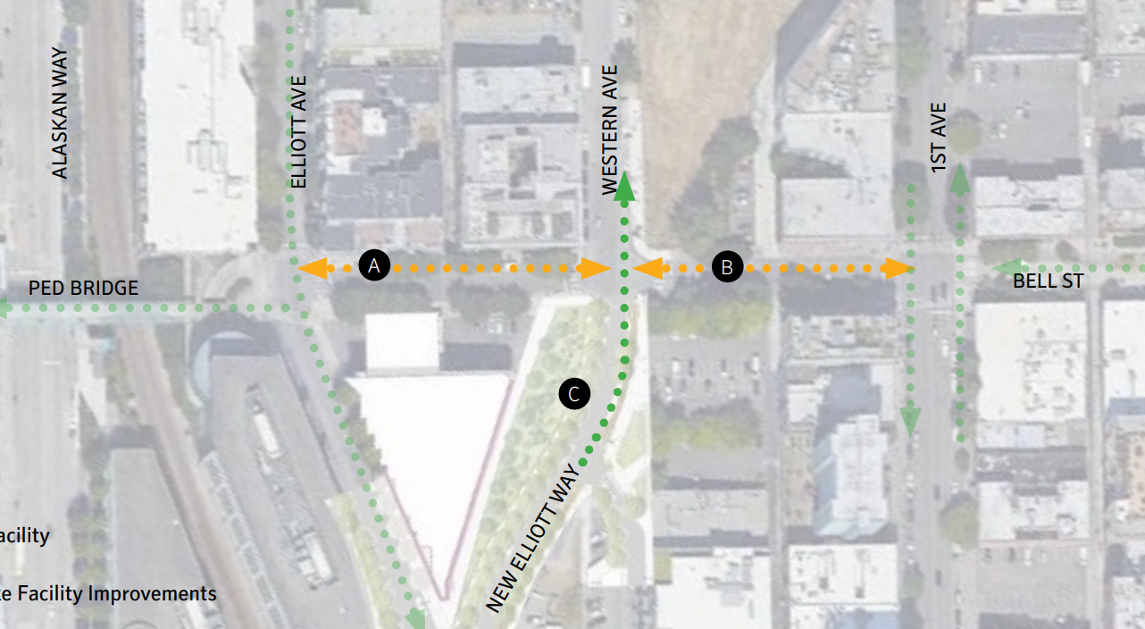 The Bell Street project, one of the last waterfront projects to start design, currently includes a two-way protected bike lane on Bell Street that most people unfamiliar with the route will choose instead. That will connect just one additional block up to First Avenue: Beyond there, people on bikes will have to decide whether to continue against the direction of vehicle traffic on the curbless Bell Street between First and Fifth Avenues. Biking eastbound is technically allowed, but few people do it, given the fact that drivers on Bell, who are only supposed to be using the street for one block at a time, are all heading westbound, and are likely to come face-to-face with you head-on.