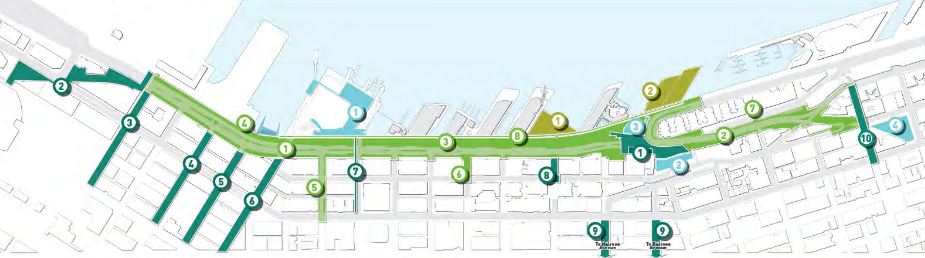 “The key transitions (E-W connections) are being considered and will be designed (not yet decided if Spring and/or Seneca Street),” the 2015 notes from the Office of the Waterfront’s presentation read.