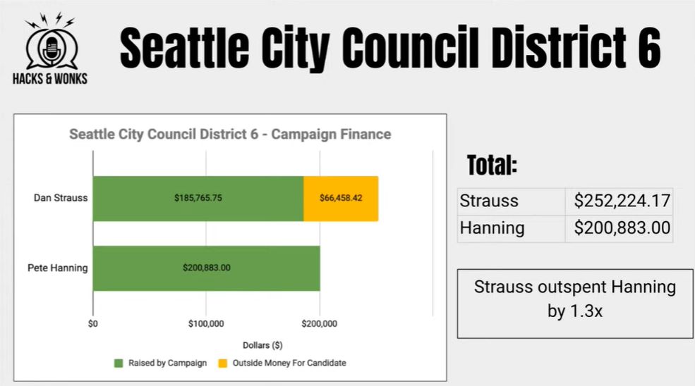Opponent Pete Hanning ran a listless campaign, which also helped Strauss. No political action committee emerged to funnel campaign cash on behalf of Hanning. Hanning tried to ding Strauss for his 2020 support for reining in police spending and the harsher tactics the department was deploying, such as chemical weapons. However, Strauss took a big swing with a campaign mailer loudly proclaiming that defund was a mistake and that he supports fully funding the Seattle Police Department and the mayor’s plan to hire 500 cops.