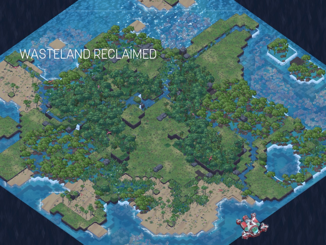 As each stage progresses, the biomes start to differentiate. Tundra turns to trees. Stones turn to lichen forests. Deep water turns to coral reefs. At the edges of these, animals appear. When the land achieves a certain balance, it’s time to clean up. You get an airship and transport system, then have to step backwards from the outside of the map, recycling equipment as you go. Once the garden is set, you lift off for the next level.
