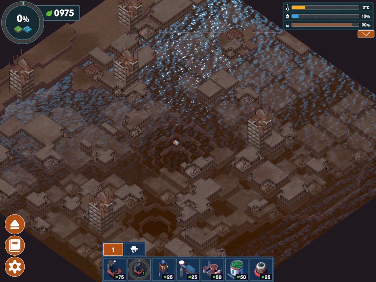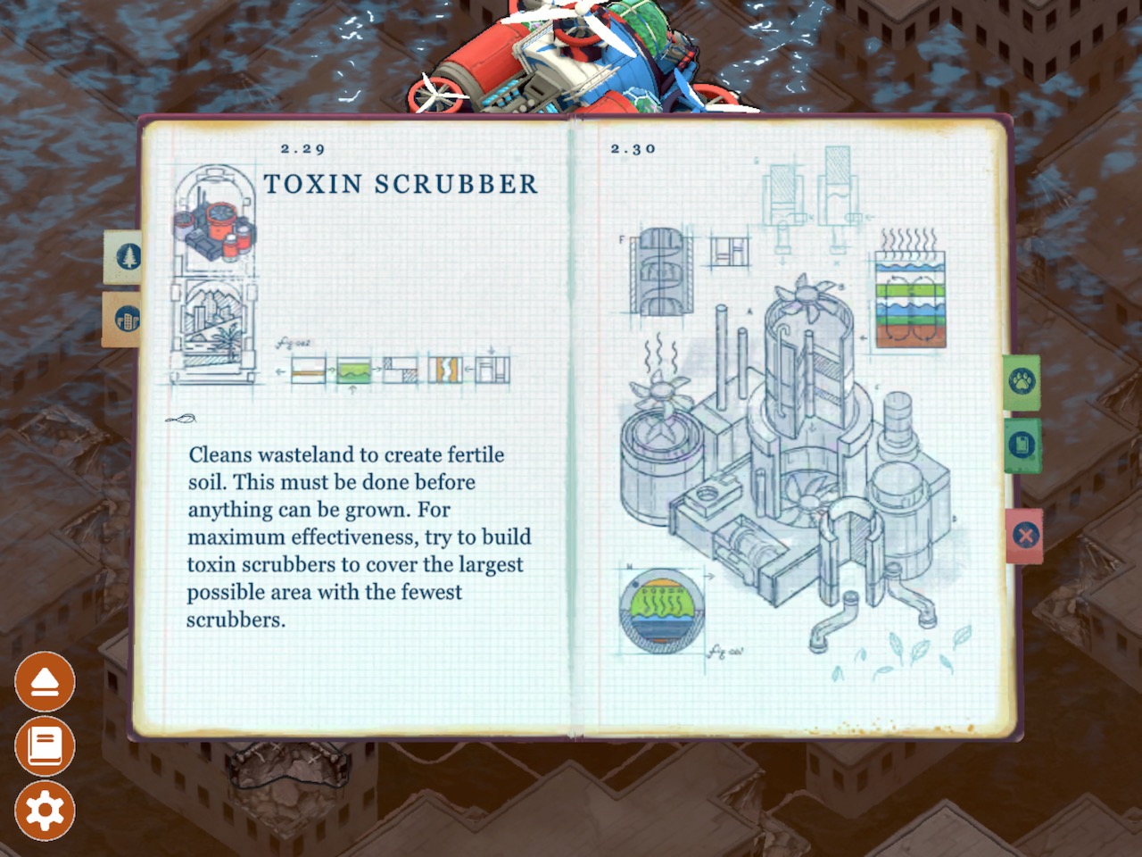 Each level starts with a short description of the landscape to be worked and some of the initial hurdles to be unraveled. The flooded city, for example, doesn’t have enough plantable land between the ruins. So that needs to be reclaimed from the sea floor with dredgers. But the dredgers make the land unstable and too much digging will result in damaging earthquakes. Other biomes require the player to treat tainted land or blast open volcanic rock.