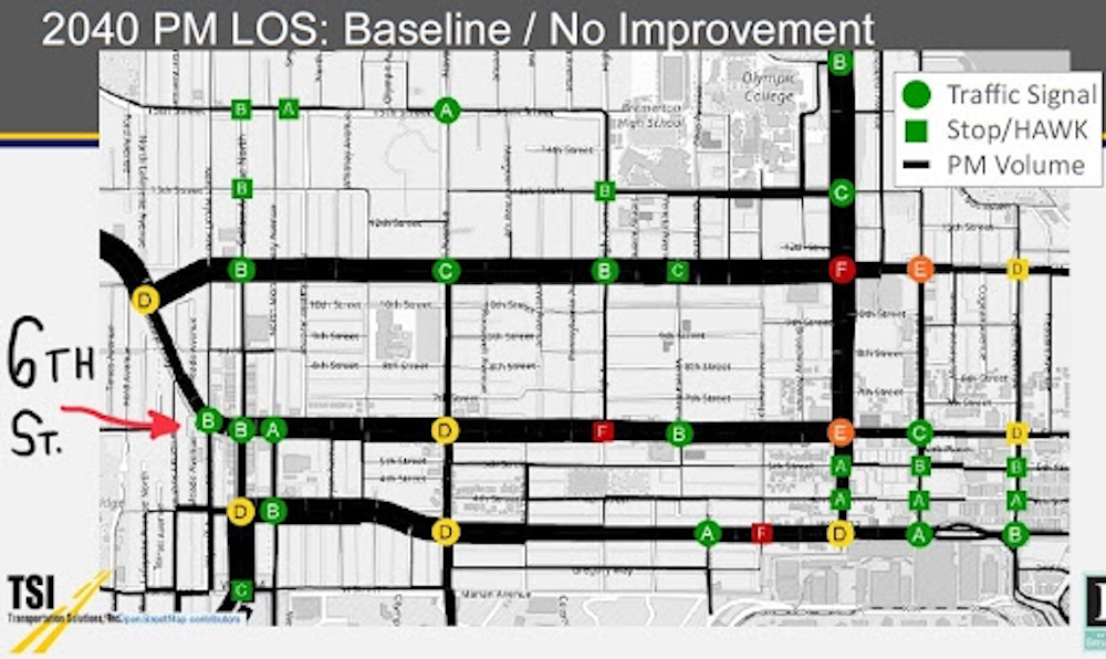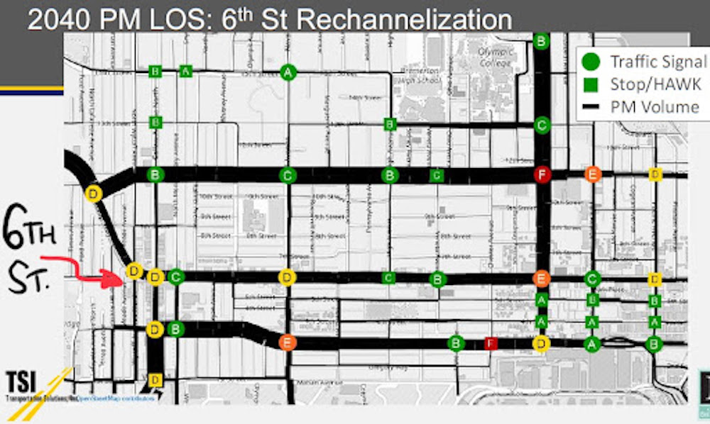 • “[N]one of the evaluations or design has been completed yet”: In fact, a tremendous amount of work has been done to plan for the 6th Street road diet since 2007. One recent example is the: 2020 6th Street Road Diet Traffic Engineering Maps that were created for the City of Bremerton by PH Consulting, completed as part of a grant application. Another is the 2020 6th/11th Corridor Feasibility Study – This $100,000, 250-page ‘6th/11th 2020 Corridor Study’ analyzed pre-pandemic traffic flows at every major intersection along Central Bremerton’s 6th Street and 11th Street. The study concluded: “A road diet is typically the preferred tactic for minor and collector arterials, while access management is typically the preferred tactic for principal arterials. Following this logic, 6th Street is a logical candidate for a road diet.”