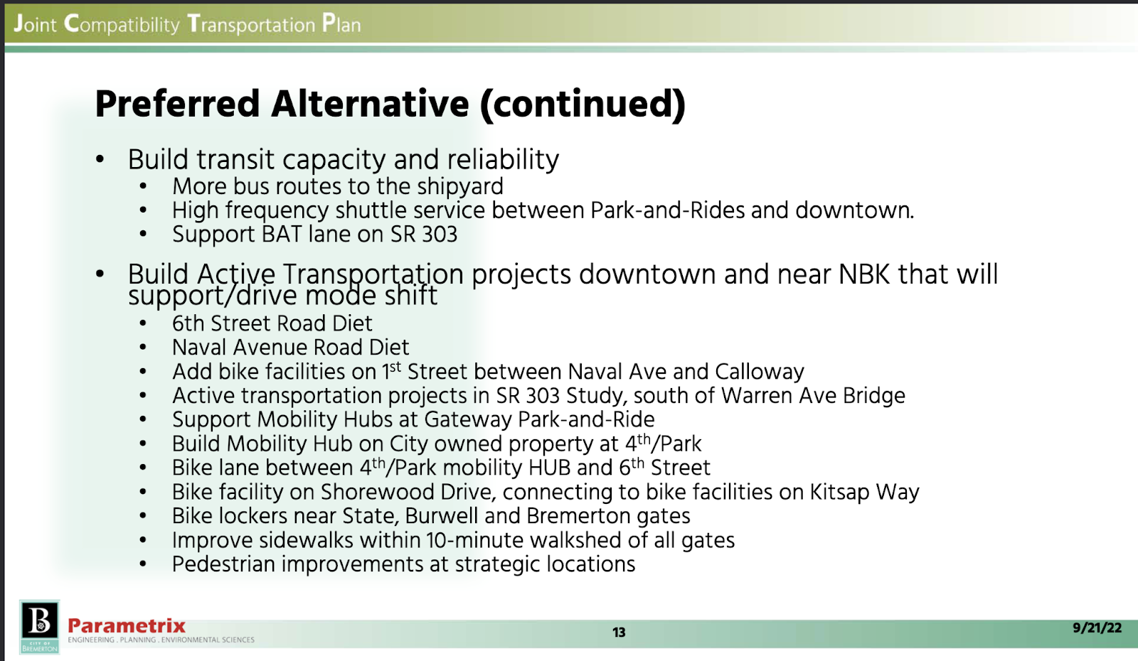 A slide of the ‘Preferred Alternative’ for Bremerton’s transportation future from the Joint Compatibility Transportation Plan, chaired by Bremerton Mayor Wheeler. Note that the 6th Street road diet is the first active transportation recommendation. (Parametrix Engineering)