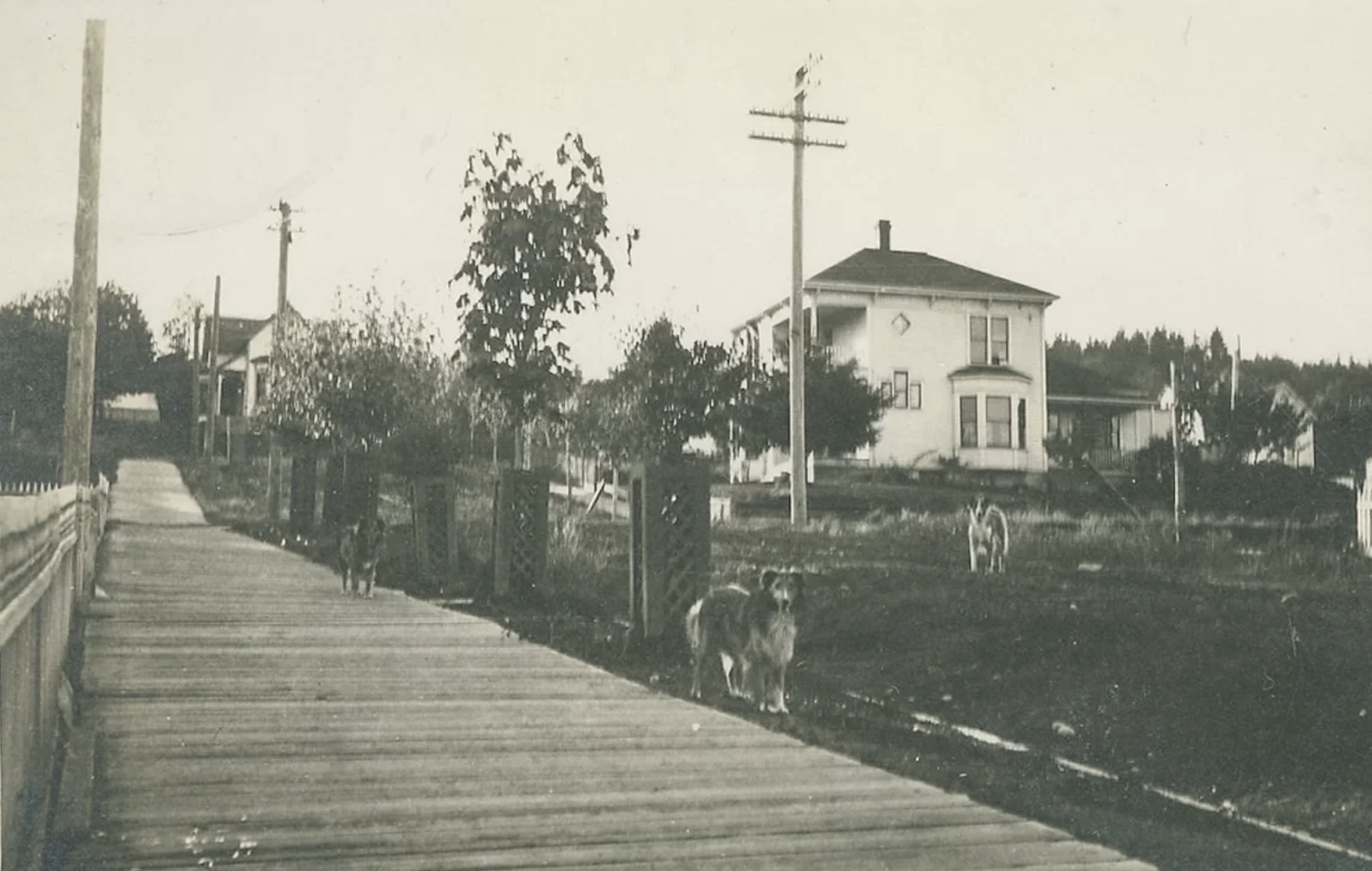 The first known photograph (approx. 1910) of the boardwalk that became 6th Street. One mile separated the cities of Bremerton and Charleston. The two cities merged in 1927. (Kitsap History Museum)