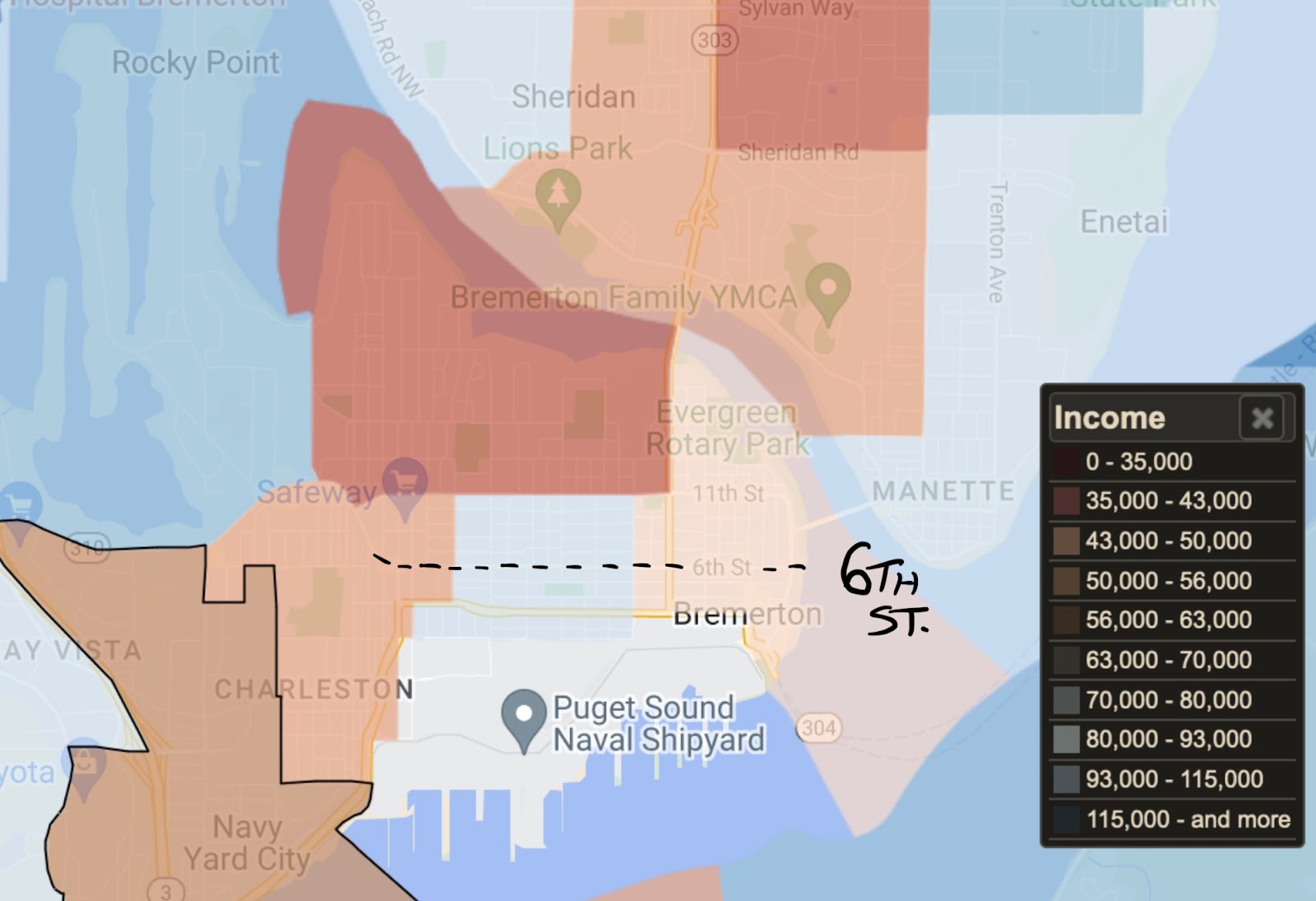 6th Street passes through three low-income census tracts. 69.1% of Bremerton Public School students are low income. OSPI (Image: www.justicemap.org)