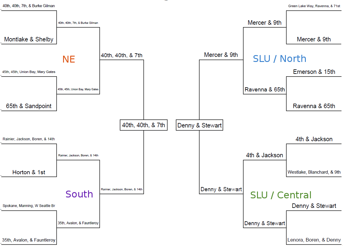 The former champion will face off in the finals against NE 40th St, NE 40th St, and 7th Ave NE in the University District. This intersection has the unique distinction of having four intersecting streets with the same name. In last week’s semifinal competition, this five-way intersection beat another five-way intersection, Rainier Ave S, S Jackson St, Boren Ave S and 14th Ave S. The latter intersection at the border of the International District and Seattle’s Atlantic neighborhood had twice as many unique street names as the winner, but it received fewer votes.