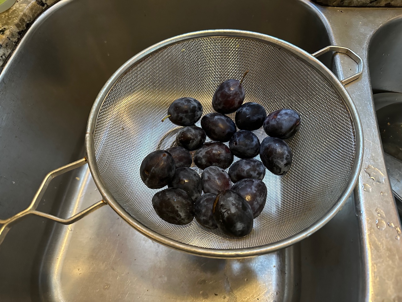 Fairly tiny, it’s possible to get nine in a Ziplock sandwich bag, three dozen in a lunch bag. Which is nice and convenient for being dropped off in the mailbox by friends whose abundant tree production must leave their house. Technically the fruit doesn’t HAVE to go, but plums are famous for the gastrointestinal impacts of eating too many. On the level of another Seattle pastime: overdrinking coffee. And we avoid disagreeable digestive disasters just before autumn’s obligatory pumpkin spice lattes.