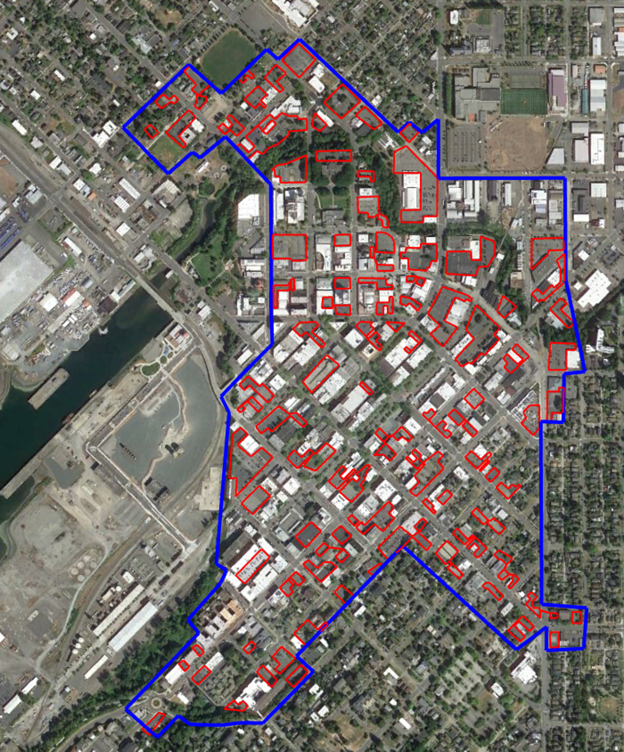 For simplicity’s sake, I limited my focus on the downtown area, more specifically the Downtown Urban Village District as defined by the municipal government in its adopted plan from 2014. Using Google Earth’s 3D Polygon tool, I traced out the area of downtown, as well as the area of parking lots within downtown. I excluded parking stalls used for holding uses essential for business operations like an auto repair yards and the downtown farmer’s market lot. (Note: While Bellingham does have a downtown parking inventory, it has not been updated since 2010.)