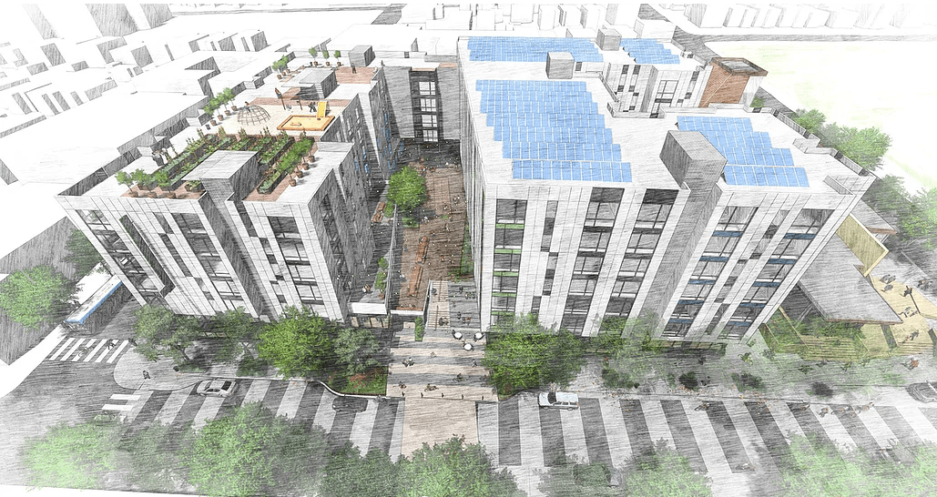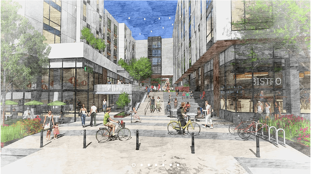 A pedestrian plaza will offer a shortcut through the middle of the site toward Roosevelt High. (Credit: GGLO)