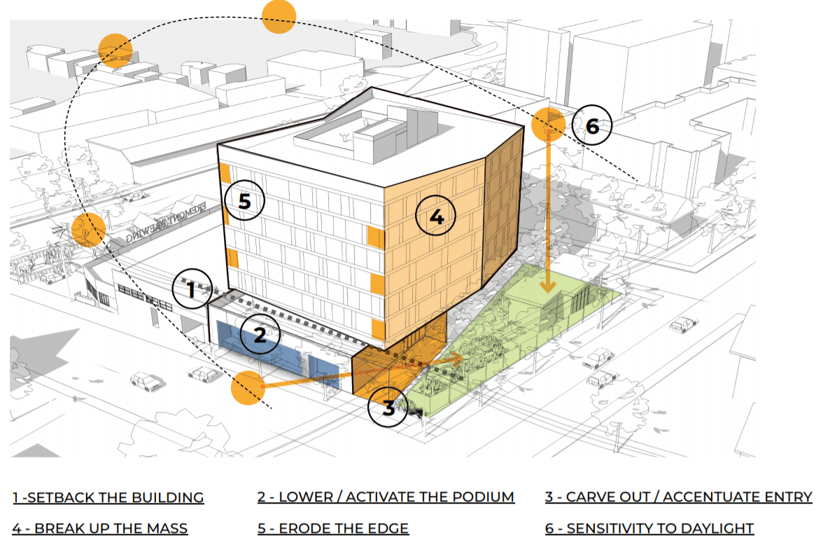 Hybrid Architecture’s preferred scheme is a “Flying V” design could add some visual interest to the block while also allowing more light to the north where Urban Earth nursery sits–potentially defusing a landmine for the project.