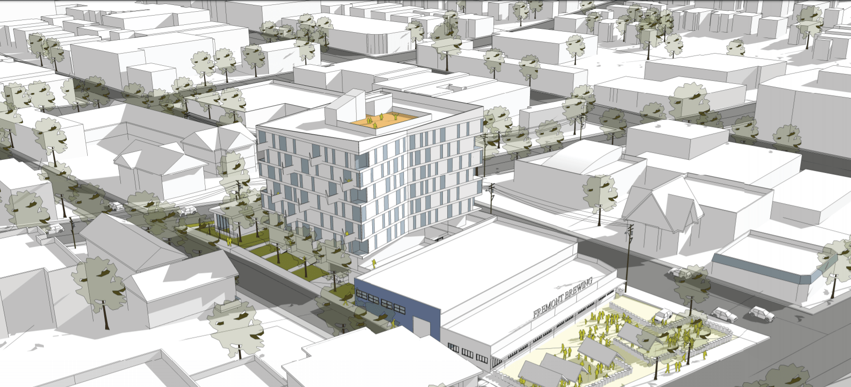 The first project is on a spacious 35,000 square foot lot at 4106 Stone Way. The second is a snug 13,000 square foot lot sandwiched between Fremont Brewing and Urban Earth garden center at 3421 Woodland Park Ave N. Nonetheless, the first site will get only 113 homes and the second will get 123 homes. The project achieves more homes on a much smaller lot through the power of moderately-sized apartments and greater zoning capacity via imminent Mandatory Housing Affordability (MHA) rezones.