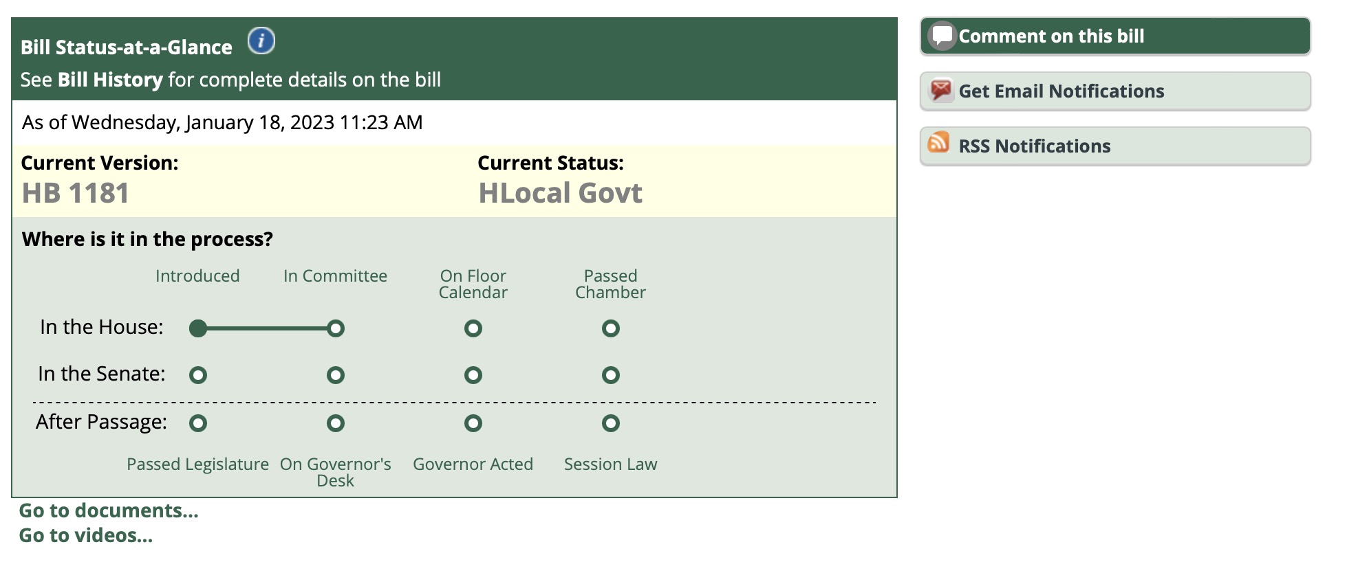 - Current Status: Jan. 17 – Public hearing in the House Committee on Local Government at 10:30am.
