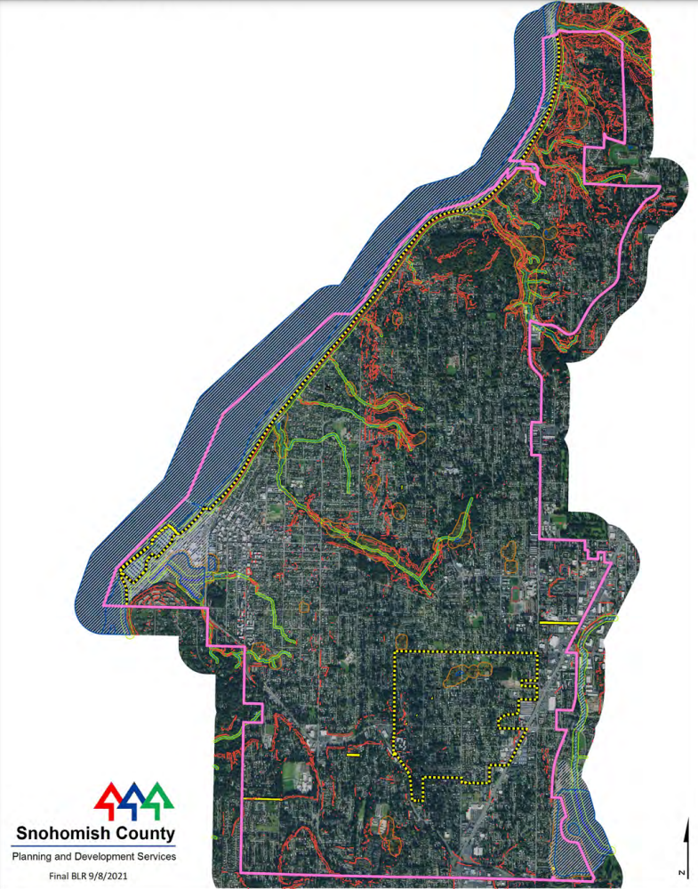 A map of Edmonds reveals that there are some critical areas where development capacity wouldn’t be increased under HB 1110, but wide swaths of the city where that is not the case. (Image: Snohomish County)