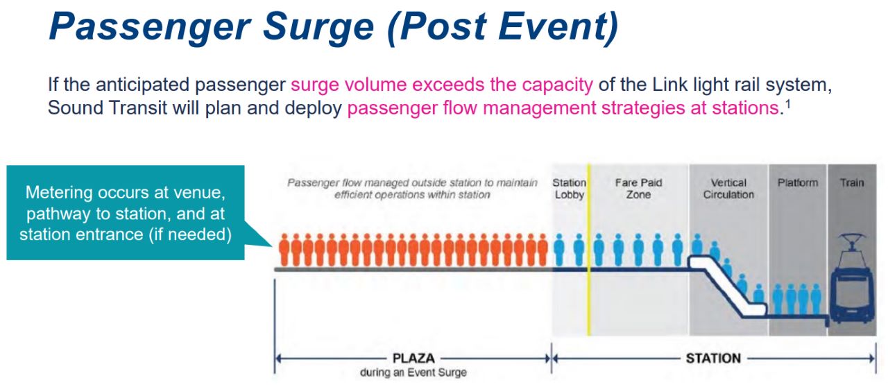 We note the extremely narrow sidewalks at the approach to Seattle Center, which will clearly be inadequate for the crowds of people arriving for concerts, events, or hockey games. Frausto notes that the city’s lauded (but perennially delayed) Thomas Street Redefined project to improve the pedestrian approach to MoPOP and the Space Needle could be a model for this area.