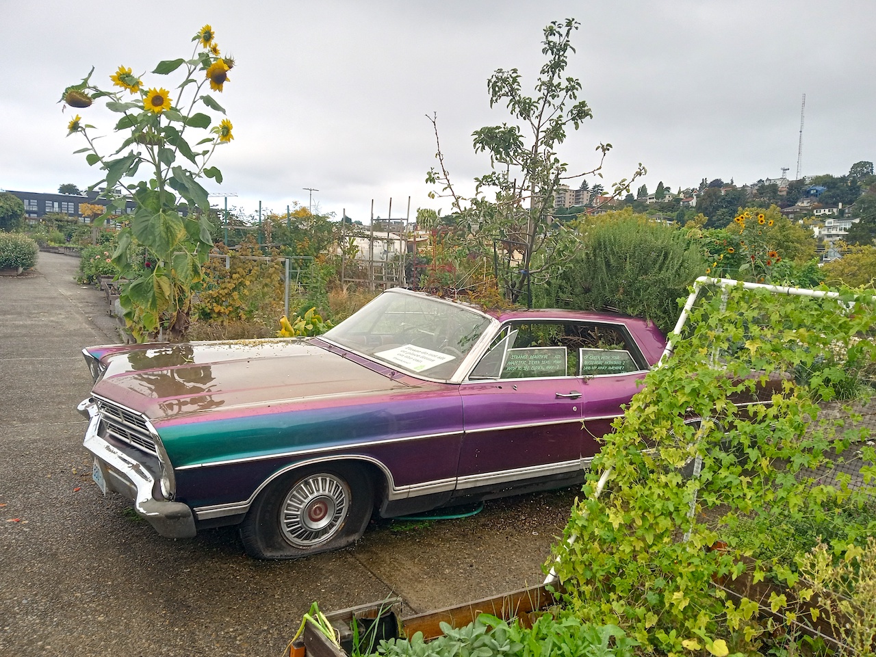 In another part of the neighborhood we visited the quirky P-patch community garden on the roof of a city-owned parking lot across Mercer from McCaw Hall and Seattle Rep. The building is a money-maker for the city, but Frausto wonders if it could be put to better use. She notes that Climate Pledge, by giving transit passes to ticket-holders, has far surpassed their goals for getting people out of cars.