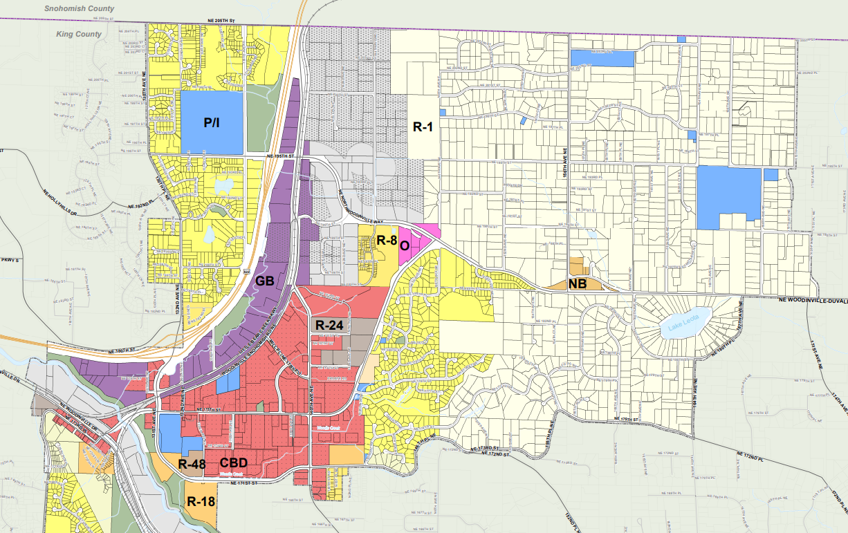 Millman drove me out to the fringes of the city where R-1 single family zoning dominates and the focus of the city’s concerns around the state raising the level of minimum density allowed on residential lots to four units, as in the original version of HB 1110. Woodinville is on the edge of the growth boundary established in the 1990’s by the Growth Management Act (GMA), which also set growth targets that cities within the boundary had to meet or face (mild) consequences.